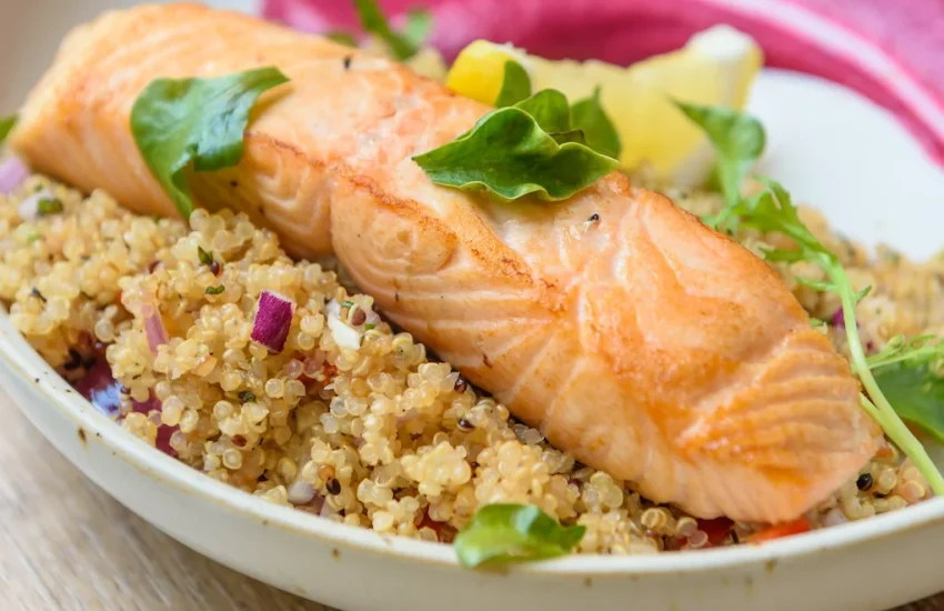 Introduction This dish combines tender, oven-baked salmon with a soft, mildly seasoned quinoa and vegetable mixture. Salmon is rich in