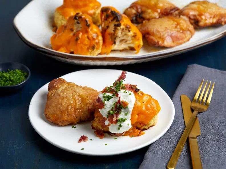 - Serve the chicken alongside the loaded cauliflower directly from the sheet pan.